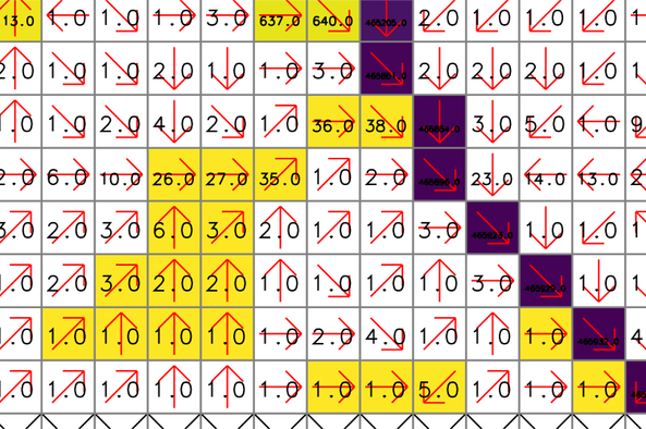 In this example, r.accumulate and r.stream.extract produced slightly different stream networks where the flow turns 90 degrees or there are multiple downstream cells with the same elevation. The following figure shows an example where the streams (red from r.stream.extract) and streams_new (blue from r.accumulate) vector maps present different stream paths. The numbers show cell elevations (elevation map), and the yellow (drain_directions map) and green (drain_directions_2 map) arrows represent flow directions generated by r.watershed with -s flag and r.stream.extract, respectively. Note that the two flow direction maps are different.