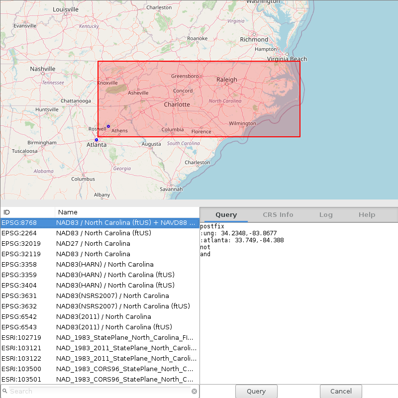 g.projpicker query="postfix unit='US foot' '34.2348 -83.8677' '33.7490 -84.3880' not and"
