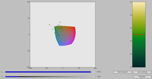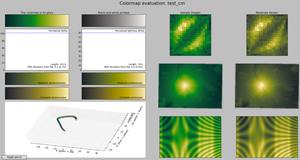 Editing color table in viscm (right): the yellow dot on the blue spline must stay in the colored area as the red line moves. Reviewing color table properties is done using several displays including color blindness simulations.