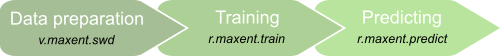 - v.maxent.swd, creating species and background swd files and prediction rasters that can be used directly by the r.maxent.train addon (or the Maxent software itself) to create species distribution models.