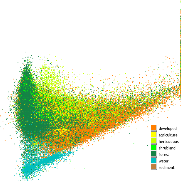 r.scatterplot input=lsat7_2002_30,lsat7_2002_40 output=scatterplot color_raster=landclass96