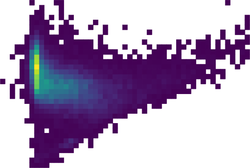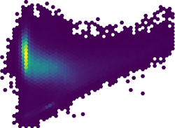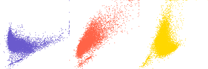 Figure: High density scatter plot visualized using binning into rectangular grid, hexagonal grid, and dense rectangular grid