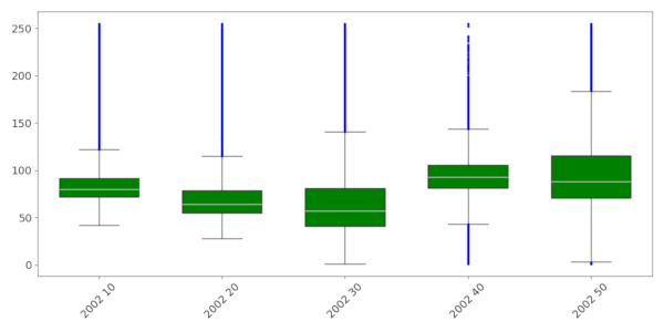 r.seriesboxplot draws boxplots of series of input raster layers. It can be used to display both temporal patterns and spatial variation.