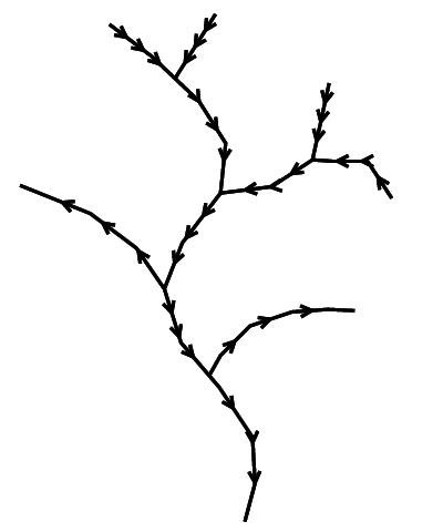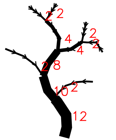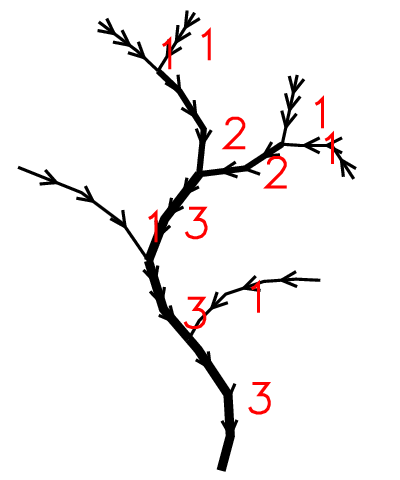 3. if the node has two or more tributaries with greatest order i, then the Strahler order of the node is i + 1.
