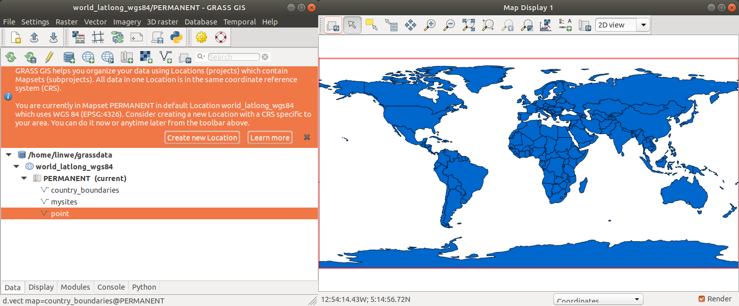 When launching GRASS for the first time, you will open a default project "world_latlog_wgs84" where you can find a map layer called "country_boundaries" showing a world map in the WGS84 coordinate system.