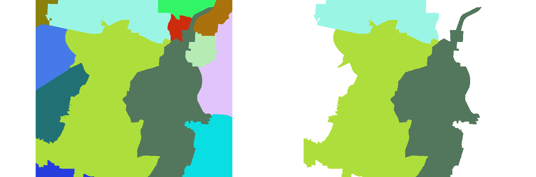 In this example, the ZIP code map in the North Carolina sample dataset is filtered for smaller areas which are substituted with the value of the respective adjacent area with largest shared boundary. Reclass by substitutional removing of areas minor of 1000 ha: