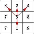 Flow directions are computed using either the MFD (Multiple Flow Direction) model or the SFD (Single Flow Direction, or D8) model, illustrated below. Both methods compute downslope flow directions by inspecting the 3-by-3 window around the current cell. The SFD method assigns a unique flow direction towards the steepest downslope neighbor. The MFD method assigns multiple flow directions towards all downslope neighbors.
