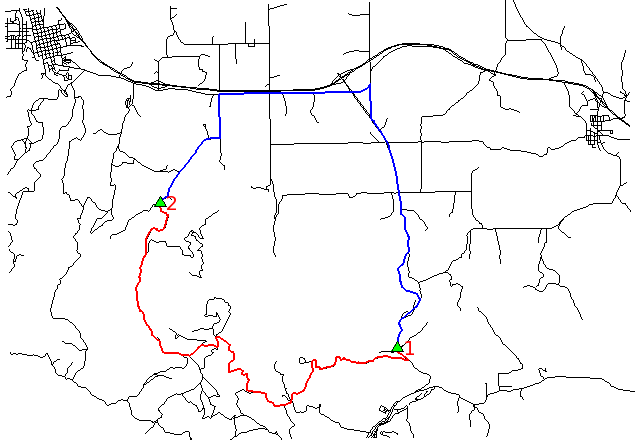 Shortest (red) and fastest (blue) path between two digitized nodes (Spearfish):