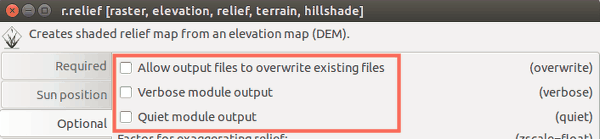 Each parameter can have different type of input fields, for example text entry or drop-down list. Flags are represented as checkboxes. The parameter (or flag) name is visible on the right side of each input field so that it is simple to understand how the module dialog relates to the command representation which is used in the manuals and tutorials. The commands can be used to call the module in the command line, Shell scripts or, with a slight modification, in a Python script.