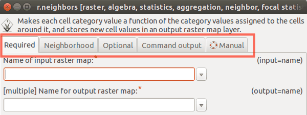 GRASS functionality is organized into modules, which are standalone programs with defined interface. Their graphical user interface (GUI) is a dialog with several tabs which organize module parameters into groups.